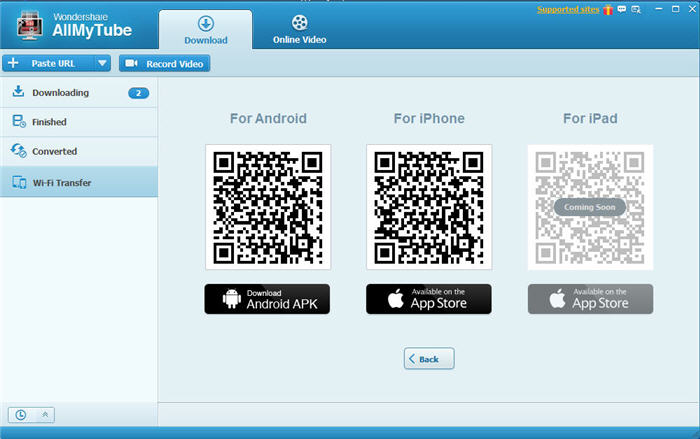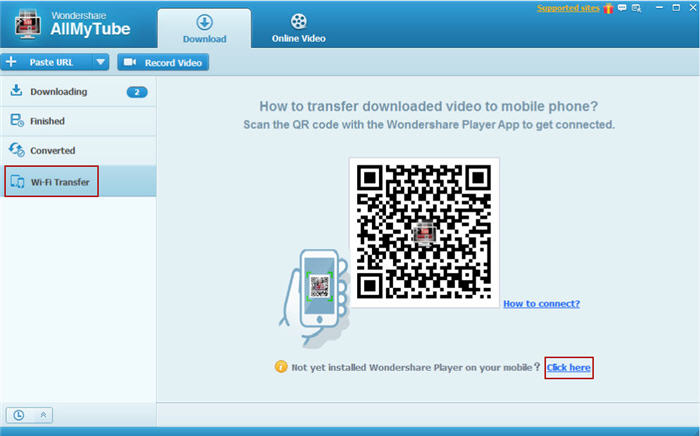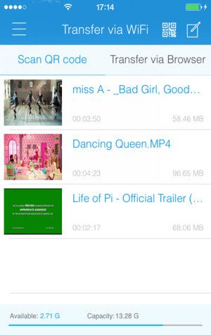 一旦它安裝在您的移動設備上啟動 Wondershare Player 的應用程序。然后選擇通過 WiFi 選項轉移并使用掃描儀掃描 QR 代碼表明你 AllMyTube 連接菜單上建立數(shù)據(jù)傳輸連接通過您現(xiàn)有的 Wifi 網(wǎng)絡。