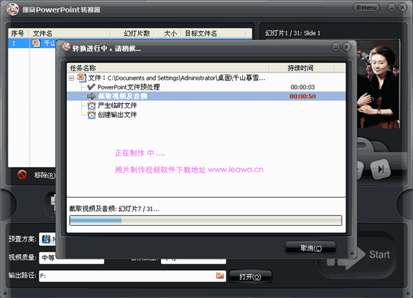 貍窩照片制作視頻軟件可把ppt格式幻燈片轉(zhuǎn)換為視頻格式。輸入PPT文件即可輸出格式為avi、wmv、mpeg、flv、mp4、vob、3gp、3g2、mov、ipod、iphone、psp、pmp、等的流行視頻格式。與其他的電子相冊(cè)制作軟件制作不同,貍窩照片制作視頻軟件不用規(guī)規(guī)矩矩單一的模板套用,應(yīng)用原理是利用PPT幻燈片的制作,將照片套用各種PPT背景圖片、不同的PPT模板,也可插入視頻跟字幕、水印和動(dòng)畫(huà),就可以輕松在家中擁有影樓級(jí)別的照片制作技術(shù)!把照片變成以音樂(lè)視頻形式呈現(xiàn)與人分享!
