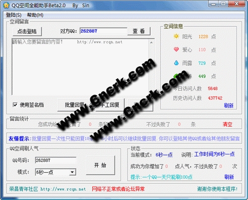 主要功能有: 1.批量刷留言。 2.刷人氣 3.有4種刷人氣模式 4.快速查看QQ空間信息 5.一個(gè)QQ限制1天只能刷100點(diǎn)