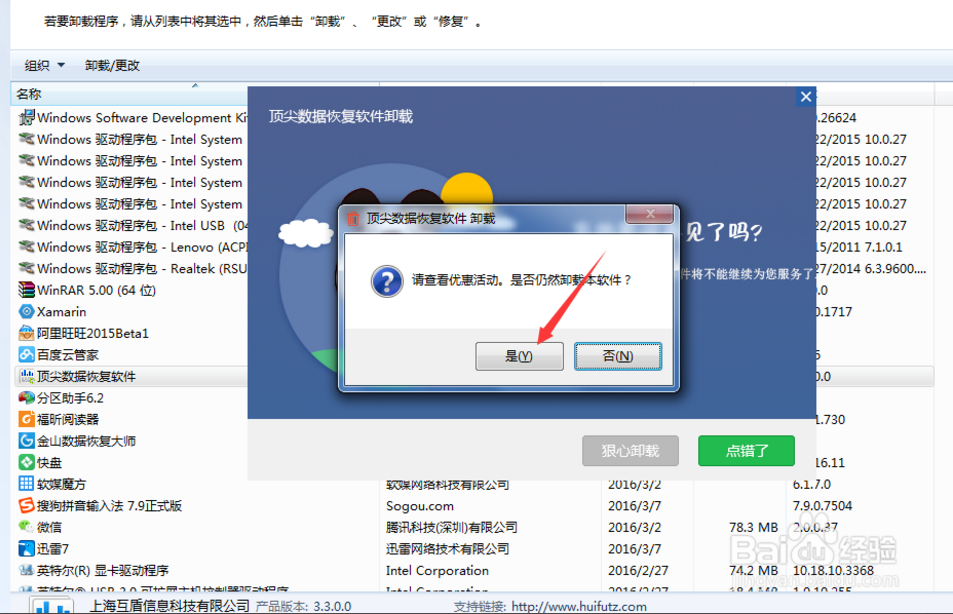6、這里會出現(xiàn)一個界面詢問你是否卸載, 我們點擊是,這里會彈出一個網(wǎng)頁,我們直接關(guān)閉即可,然后繼續(xù)點擊是。