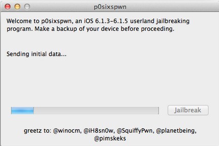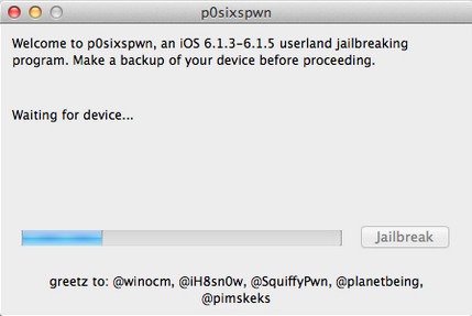 本次p0sixspwn mac版越獄工具不需要在iOS設(shè)備上操作,越獄過程請勿斷開設(shè)備連接。肥x經(jīng)測試:iPod Touch4 、iPod Touch5、iPhone 4(GSM) 6.1.3、6.1.5固件越獄暫沒發(fā)現(xiàn)問題。越獄過程大概需要10分鐘左右(與網(wǎng)絡(luò)環(huán)境相關(guān)),請耐心等待《p0sixspwn》提示完成。【使用方法】