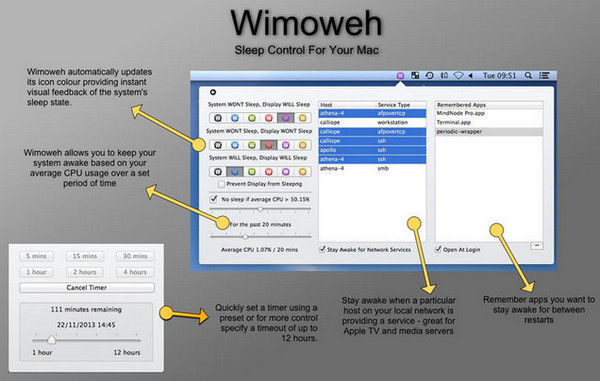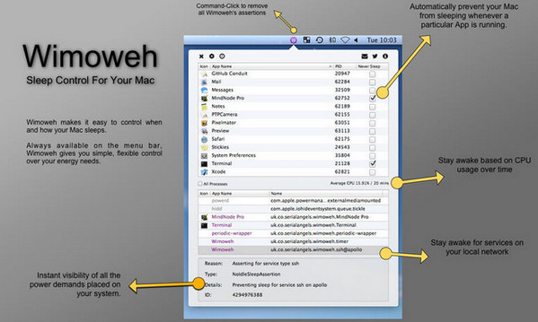 Mac用戶(hù)們會(huì)發(fā)現(xiàn),Mac OS系統(tǒng)進(jìn)入睡眠狀態(tài)之后軟件都會(huì)停止工作,而有的時(shí)候我們是不希望系統(tǒng)睡眠的。例如下載大文件的時(shí)候,這個(gè)時(shí)候mac禁止睡眠軟件(Wimoweh)就是一個(gè)很有用的工具了,能夠單獨(dú)指定其他應(yīng)用程序來(lái)阻礙系統(tǒng)休眠,來(lái)實(shí)現(xiàn)你的目的。
