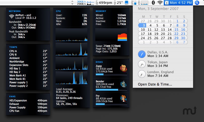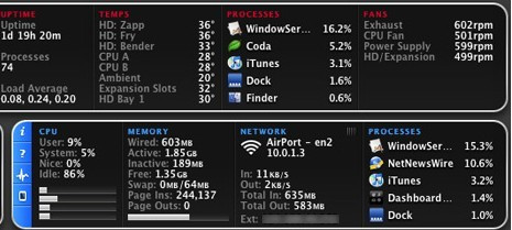 iStat pro mac一個(gè)高度可定制的Widget不見,在其中你可以監(jiān)視幾乎關(guān)于你Mac運(yùn)行的一切東西,包括CPU, memory, disks, network, battery, temperatures, fans, load & uptime 以及processes。iStat pro有9款不同的皮膚顏色,你可以隨時(shí)變換色彩。