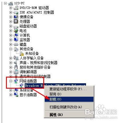 3、再有的辦法就是網(wǎng)卡的驅(qū)動(dòng)問題了。由于Windows 7是一個(gè)比較新的系統(tǒng),所以在“設(shè)備管理器”中把網(wǎng)卡給卸載,然后重新啟動(dòng)電腦,啟動(dòng)后win7會(huì)自動(dòng)安裝自帶的驅(qū)動(dòng)。