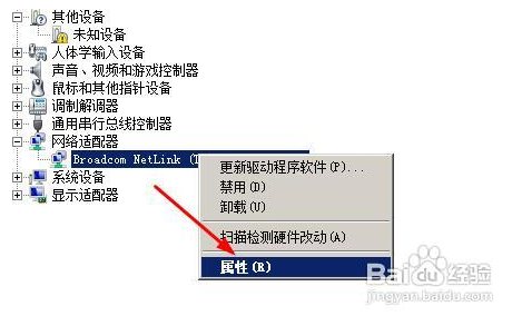 8、繼續(xù)上面的步驟,還是在設(shè)備管理器中找到你的網(wǎng)卡,然后右鍵單擊選擇屬性。