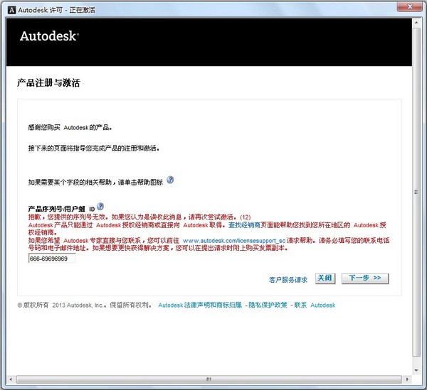 5.點(diǎn)擊繼續(xù)之后,它會(huì)提示你,你的序列號(hào)是錯(cuò)誤的,此時(shí),點(diǎn)擊下一步旁的“關(guān)閉”按鈕,重新激活