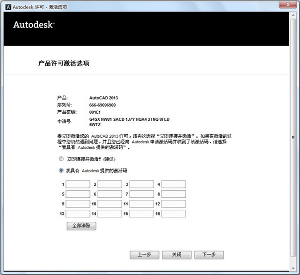 9、最后復(fù)制 Activation 中的激活碼至“輸入激活碼”欄中,并點(diǎn)擊“下一步”提示“AutoCAD 2013已成功激活”