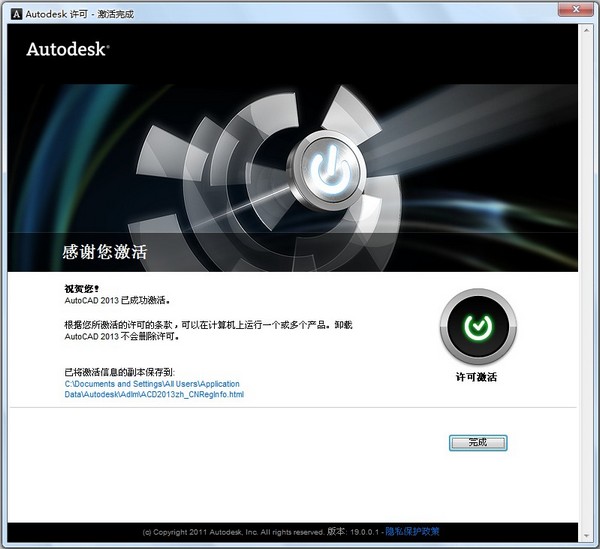 8.上述操作無(wú)誤后,軟件會(huì)提示,你已成功激活,表示你已擁有一個(gè)完全注冊(cè) Autodesk 產(chǎn)品。