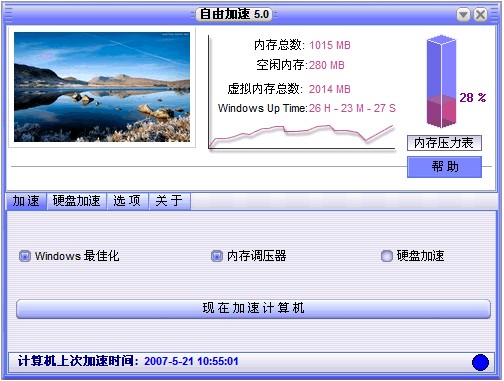 最新版自由加速Speed It Up Free 5.00軟件,是國(guó)外最受歡迎的,軟件雖小,功能極為強(qiáng)大,呵呵,它不是感覺(jué)的,你在沒(méi)使用它之前,可以測(cè)試一下。
