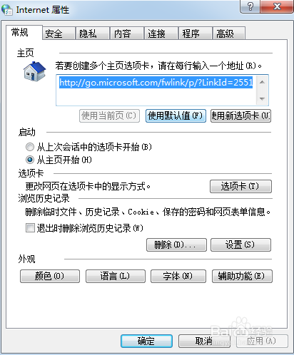 6.Internet 屬性→常規(guī)→主頁→修改成自己喜歡的主頁→確定。