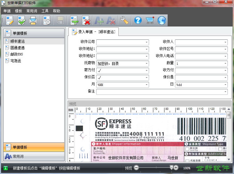世新單據(jù)打印軟件是一個(gè)通用單據(jù)打印軟件,適合打印快遞單、出貨單、支票等各種單據(jù)。軟件內(nèi)置了幾種常用單據(jù)模板,用戶可以方便地創(chuàng)建單據(jù)模板,根據(jù)需要設(shè)置錄入字段。世新單據(jù)打印軟件使用所見即所得的設(shè)計(jì)方式,用戶可以方便地看到單據(jù)錄數(shù)據(jù)后的實(shí)際效果。【世新單據(jù)打印軟件功能特點(diǎn)】