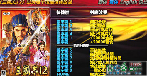 三國志12修改器是游戲三國志12的專業(yè)輔助修改工具,這款修改器為大家?guī)砹?0項基本功能的修改,讓玩家在游戲中能輕松解決任何問題,大大降低游戲難度,非常的好用。