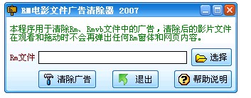 RM電影文件廣告清除器 V4.86 綠色免費(fèi)版 本程序可以清除REAL影片文件(RM/RMVB/RA格式)中的惡意彈出廣告代碼,幫助廣大網(wǎng)友遠(yuǎn)離廣告騷擾及木馬威脅,清除后的影片文件在觀看和拖動(dòng)時(shí)不會(huì)再彈出任何Rm窗體和網(wǎng)頁內(nèi)容