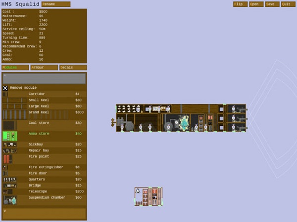 《飛艇》(Airships)游戲首先給人的第一印象就是全屏好大的馬賽克,但看游戲畫(huà)面的話(huà)會(huì)讓人覺(jué)得一切都難以辨認(rèn),然而游戲開(kāi)始是需要玩家用部件一個(gè)個(gè)的去自己去設(shè)計(jì)拼湊建造飛船的,所以游戲時(shí)不會(huì)覺(jué)得畫(huà)面有太大問(wèn)題。飛艇的部件很多,建造環(huán)節(jié)可以發(fā)揮玩家自自由的想象力,不過(guò)要注意預(yù)算,同時(shí)右上角會(huì)有紅色提示,提示哪部分還不能讓飛艇完工。雖說(shuō)游戲也有戰(zhàn)斗元素,不過(guò)如何設(shè)計(jì)好自己的飛艇,讓其盡可能的完美適應(yīng)戰(zhàn)場(chǎng),才是這個(gè)游戲的精髓所在。這個(gè)游戲的核心就是設(shè)計(jì)飛艇然后和它們一起戰(zhàn)斗,飛艇是一個(gè)拼湊出來(lái)的模塊,并且模塊的布局關(guān)系重大,船上的一切都需要飛艇水手跑來(lái)跑去,運(yùn)送煤炭、彈藥、水和修復(fù)工具等,當(dāng)然,他們也有可能會(huì)倒下。