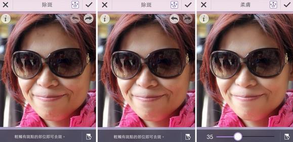 玩美相機(jī)的「美容工具」提供了許多針對人臉美化的工具,包括美膚、美白、去油光、去紅眼、去眼袋等等,像圖中便套用了除斑跟柔膚兩項(xiàng)工具,按下後照片便自動調(diào)整完成。斑點(diǎn)不見了,膚質(zhì)好像變得更好了!