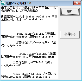 1、由于迅雷封殺,很多用戶拿到帳號(hào)之后,登錄就會(huì)出現(xiàn)異常,所以獲取到的帳號(hào)請(qǐng)不要使用網(wǎng)頁登錄。2、賬號(hào)后邊的:1和:2不要忘記輸入。