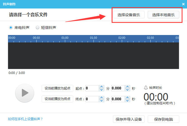 4、接著在“鈴聲制作”界面點擊“選擇設(shè)備音樂”或者“選擇本地音樂”,并把想要制作成鈴聲的音樂添加進來;