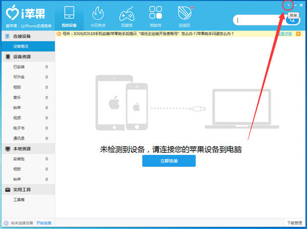 1、首先打開電腦中的i蘋果助手,然后在其右上角找到“菜單”按鈕;