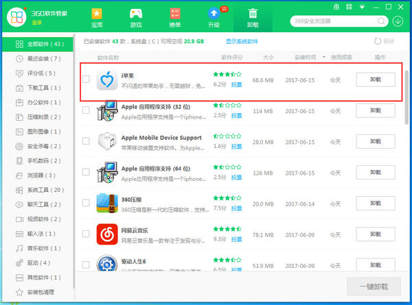 2、然后在管家的“卸載”界面中找到“i蘋果助手”,之后點擊“卸載”并根據(jù)提示操作即可將其卸載。