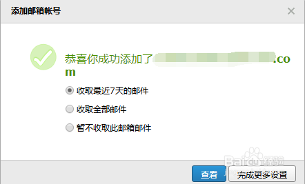 驗(yàn)證成功后,彈出一個(gè)對(duì)話(huà)框,提示添加成功,可以選擇收取郵件的時(shí)間。