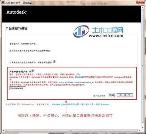 另外有一種情況是,填寫序列號和密鑰后,軟件提示您的序列號是錯誤的,這時點擊關(guān)閉等一會再點擊激活即可。