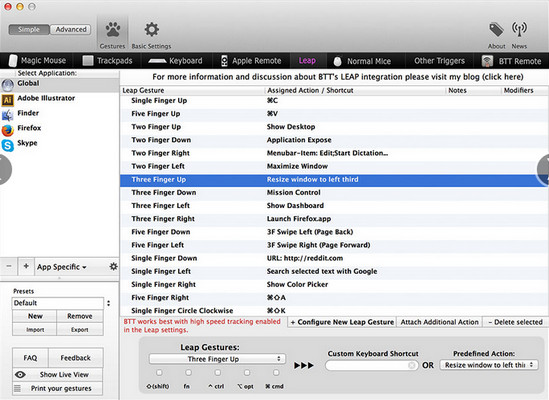 用戶使用bettertouchtool 漢化還可以對(duì)TouchPad可以進(jìn)行相同的設(shè)置。也可以調(diào)節(jié)鼠標(biāo)移動(dòng)緩慢的問(wèn)題。實(shí)現(xiàn)控制之后你會(huì)發(fā)現(xiàn) Magic Mouse 的功能比MouseZoom要強(qiáng)大的多。【軟件特點(diǎn)】