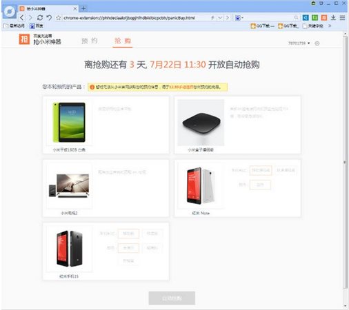 3、如果不想點擊的話,我們就看瀏覽器的右上側(cè),有一個搶字,這個就是搶小米用的,我們點擊搶字,就進入到搶小米的界面了。