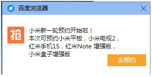 溫馨提示:小米官方預(yù)約時間為(周二下午6點-周一中午12點)百度瀏覽器的插件也會在開發(fā)預(yù)約之后,以彈窗的形式提示您2次進行預(yù)約。