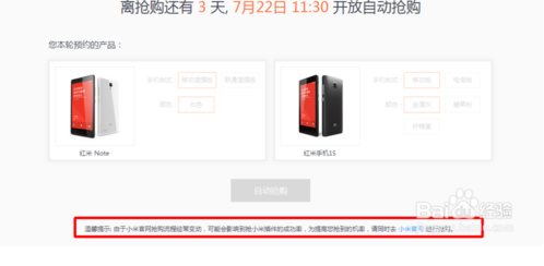 9、我們點擊上面的搶購,可以選擇版本的信息,由于時間還沒有到,所以還沒有開始搶購,在右上側(cè),我們可以設(shè)置搶購的提醒的。但是我們依然要注意最下面的一個溫馨提示,說明并不是用了這個搶小米神器就一定可以搶到了。