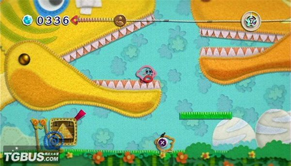 當然,這個全新的世界也帶來了新的玩法??ū鹊摹巴萄省痹谶@里已經(jīng)不是那么適用了,它有了一根松松的毛線,可以當鞭子一樣地用(通過按鍵,不是體感)。通過這根毛線,卡比可以抓住敵人,或是拆散他們,然后把他們裹成一個毛線團,可以拿來扔著當武器用。毛線還可以當成吊具來用,從一側蕩到另一側。在某些場合,卡比還可以用毛線拉開一些拉鏈,打開新的區(qū)域或路線??傊@是一根強大的毛線,在Boss戰(zhàn)中,甚至還可以抓住Boss的舌頭給它以傷害。