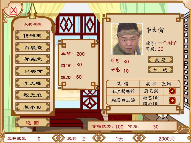 第三十天清晨有劇情,完美+1,廚房也有劇情(注意在此之前要培養(yǎng)大嘴廚藝),大嘴獲得”同福大廚“的稱號(hào),人氣+20,飲食+20,日收入+150,大嘴好感+10,完美+2;