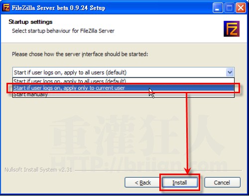 第5步、接著我們可以設(shè)定是否在開機(jī)時(shí)自動啟動「FileZilla Server Interface」伺服器管理介面,如果你常常需要管理你的FTP伺服器,可以選【Start if user logs on, apply only to current user】。一般來說都是選最下面的【Start manually】,要用時(shí)再手動開啟即可。