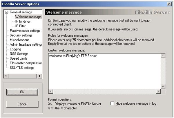 Welcome message頁面設(shè)置:客戶端登錄成功以后顯示的Welcome信息。建議不要用軟件默認(rèn)的,因?yàn)槿魏诬浖疾荒鼙WC沒有什么漏洞,如果在這里暴露軟件名稱的話,一旦這個(gè)FTP Server軟件有什么安全漏洞,別有用心的人知道了服務(wù)器軟件的名稱就可能針對性地發(fā)起攻擊。所以建議這里設(shè)置的信息不要包含任何服務(wù)器資料。強(qiáng)烈建議修改默認(rèn)的歡迎信息為“Welcom to Serv-U FTP Server”,這樣Filezilla在歡迎消息中就會Serv-U字樣,以達(dá)到欺騙攻擊者的目的。注意:本步驟非常重要!