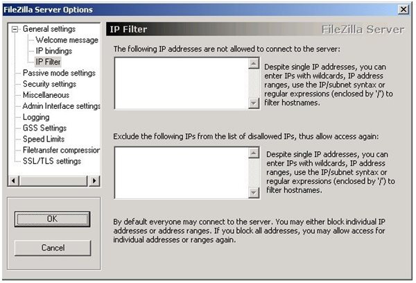 IP Filter(IP過濾器)頁面:設(shè)置IP過濾規(guī)則,在上面欄目中的IP是被禁止與FTP服務(wù)器連接的,下面的是允許的。格式:可以是單個(gè)IP地址、IP地址段,可以使用通配符、使用IP/subnet語法或正則表達(dá)式(以“/”結(jié)尾)來過濾主機(jī)名。
