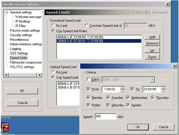 第6步、Speed Limits(速度限制):這個(gè)是全局參數(shù),默認(rèn)狀態(tài)不限速??梢赃x中“Constant Speed Limit of”并填寫限速數(shù)值來實(shí)現(xiàn)速度限制,下載(傳出)和上傳(傳入)可以分別設(shè)置。還可以根據(jù)時(shí)段自定義限速規(guī)則——“Use Speed Limit Rules”,比如這臺服務(wù)器或者網(wǎng)絡(luò)連接除了做FTP服務(wù)器之外還有別的用途,需要根據(jù)時(shí)間調(diào)度,不能讓FTP傳輸擠占所有網(wǎng)絡(luò)帶寬影響其它的網(wǎng)絡(luò)服務(wù);就可以通過這里設(shè)置。