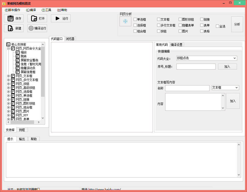 1.支持庫:這個是幫助文檔,雙擊一項即可查看代碼,右鍵可以直接放入代碼到編輯區(qū)域2.網(wǎng)頁分析區(qū):工具能夠自動探測網(wǎng)頁組件,并且能夠標(biāo)記網(wǎng)頁組件編號。