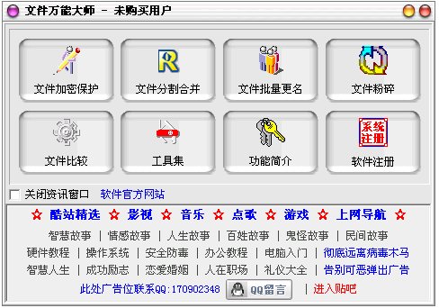 文件萬能大師是一款功能強(qiáng)大的文件處理工具。它集文件的加密保護(hù)、分割合并、批量更名、比較分析以及文件粉碎等多種功能于一身,必將大大方便您的工作。您不妨下載試試,相信您一定會喜歡它的