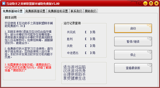 互動助手之英雄聯(lián)盟腳本輔助是一款免費的英雄聯(lián)盟外掛,擁有基礎(chǔ)設(shè)置、英雄設(shè)置和掛機(jī)設(shè)置三大模塊,包含了自定義英雄或隨機(jī)英雄、自動掛機(jī)、喊話等等多項輔助功能。