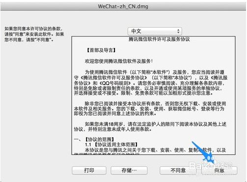 下載完成以后,運行微信Mac版安裝包,點擊“同意”按鈕繼續(xù),如圖所示