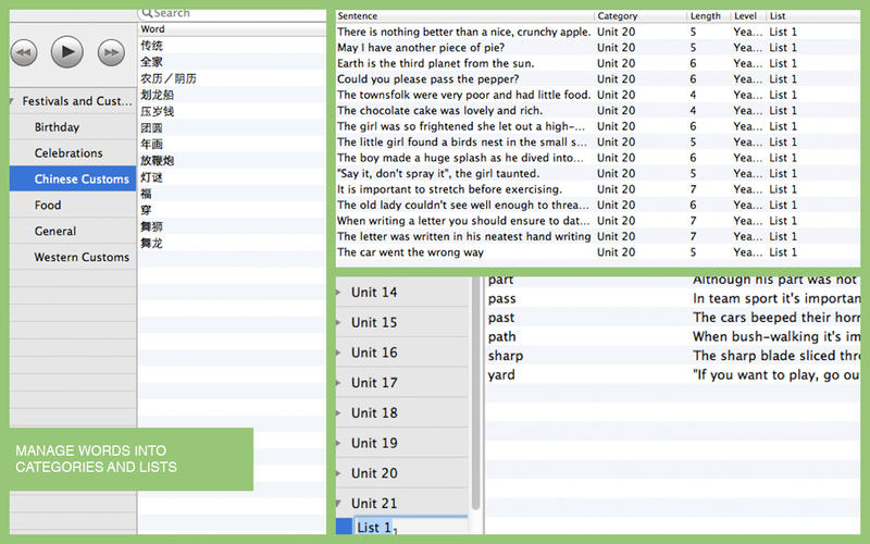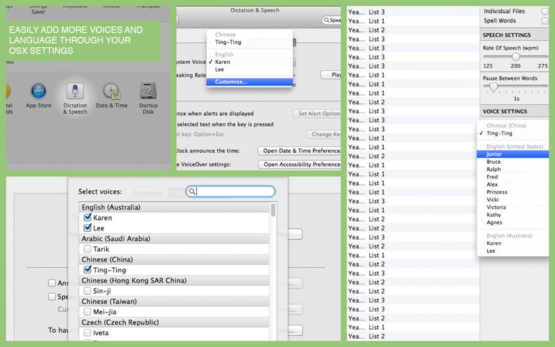 詞匯和句子可以在不同的語(yǔ)言,所以它成為一個(gè)完美的學(xué)習(xí)工具,學(xué)習(xí)語(yǔ)言或任何時(shí)候你需要說的單詞列表。列表是容易導(dǎo)出為完整的測(cè)試或單獨(dú)的音頻文件,可以被拖進(jìn)iTunes或你的最新iBooks作者項(xiàng)目。