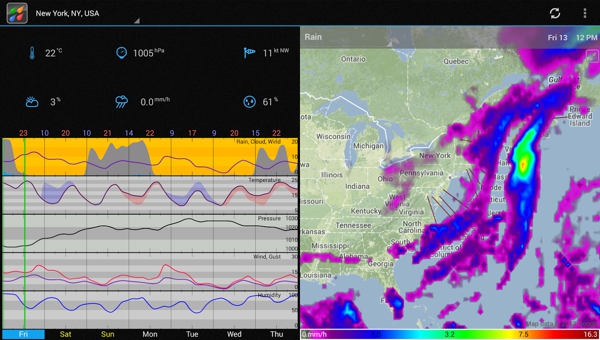 WeatherBomb是一款專業(yè)氣象信息查看軟件,可以查看詳細(xì)的天氣信息,包括溫度、降水量、風(fēng)速、云量等,數(shù)據(jù)源是 NOAA(美國國家海洋和大氣管理局)。地圖視圖到7天的數(shù)據(jù)給出平滑滾動。圖形視圖給出了周雨,風(fēng)和云的預(yù)測一目了然。預(yù)測數(shù)據(jù)包括雨,風(fēng),云,溫度,壓力和濕度的波高(為漁民和沖浪)。