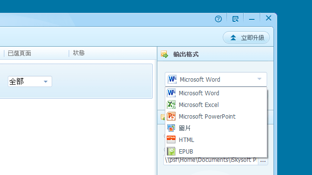 2、從右上角選擇「輸出格式」,目前支援包括 Word、Excel、powerpoint、圖片、HTML、ePUB 等格式