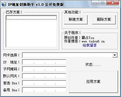 IP地址切換助手 V1.0 綠色免費(fèi)版 寫來一直自己用的輔助工具,昨天去朋友那里打魔獸,竟然好多人看著我的這個(gè)軟件都找我要,我想這東西大家可能也需要,就公布出來啦,方便本本一族到處“漂流”!