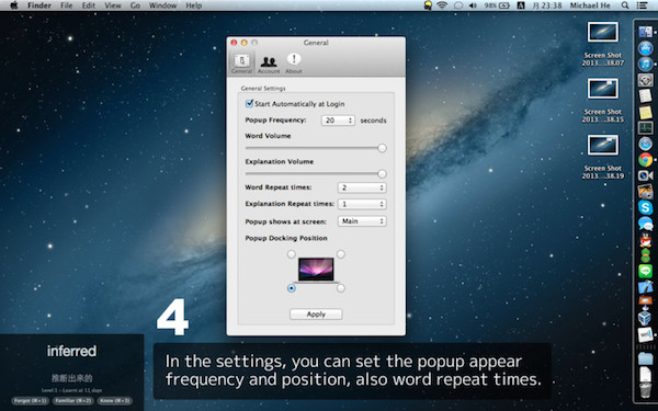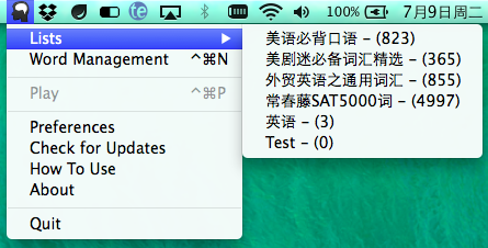 在編輯好自己的生詞表后,我們在Mac上就能啟用MF了,打開后,在Menubar上得MF菜單里選擇一個Word List,然后 開始播放生詞表即可;在單詞播放過程里我們也有充分自定義的權(quán)利,比如設(shè)置彈出頻率,單詞量,解釋量,單詞重復(fù)朗讀次數(shù),以及彈出的位置。