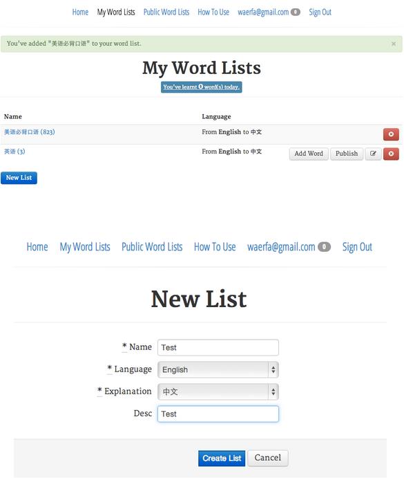 添加前選擇好外語種類,點擊藍色按鈕“Add To My List” 開始導(dǎo)入單詞表,你可以在My Word Lists里看到添加的單詞表: