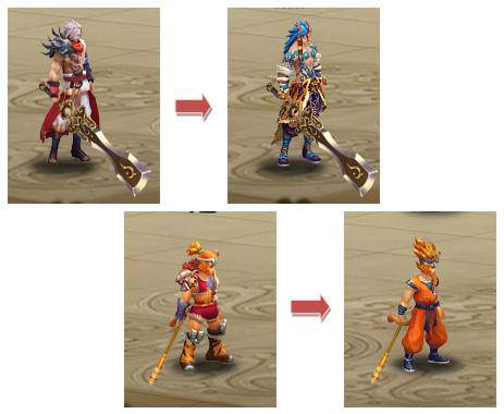 將時(shí)裝道具裝備到“時(shí)裝”欄中使用。下圖是天殺和靈猴穿戴時(shí)裝后的前后對(duì)照: