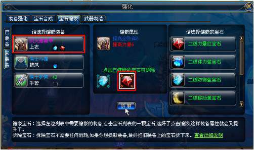 寶石鑲嵌成功后“鑲嵌”按鈕會(huì)轉(zhuǎn)換為“拆解”,左鍵選中需要拆解的寶石,然后點(diǎn)擊“拆解”可以將裝備上的寶石拆解下來(lái)