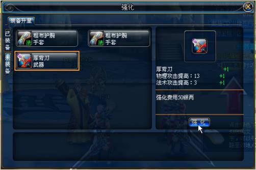點(diǎn)擊“強(qiáng)化”圖標(biāo)打開(kāi)強(qiáng)化面板,左鍵點(diǎn)擊裝備將裝備放入強(qiáng)化欄,然后點(diǎn)擊“強(qiáng)化”按鈕。裝備強(qiáng)化有一定的成功幾率,強(qiáng)化成功后裝備的基礎(chǔ)屬性會(huì)得到提升。