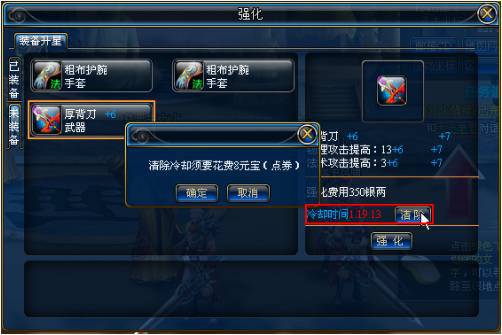 在強(qiáng)化過(guò)程中,每 “強(qiáng)化”一次會(huì)增加一定冷卻時(shí)間,當(dāng)“冷卻時(shí)間”超過(guò)60分鐘“,您需要等待冷卻時(shí)間小于60分鐘后才能繼續(xù)強(qiáng)化。點(diǎn)擊頁(yè)面中的”清除 “按鈕可以使用元寶(點(diǎn)券)立即清除冷卻時(shí)間。