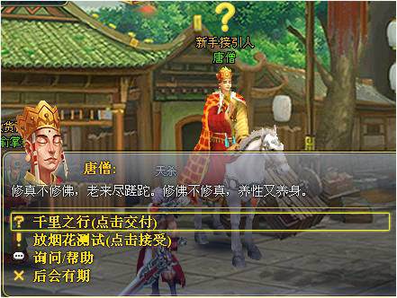 結(jié)束前面的小插曲,您會(huì)被穿越到繁華都市長(zhǎng)安城,旁邊那個(gè)頂著黃色問(wèn)號(hào)的NPC就是新手接引人唐僧。左鍵單擊唐僧可以和它交互,然后左鍵點(diǎn)擊對(duì)話中的“千里之行”交付任務(wù)。